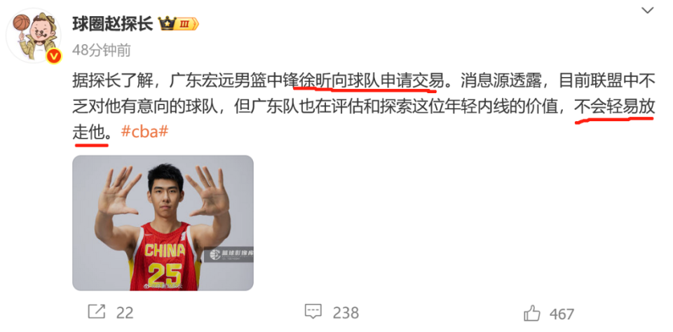 徐昕才21岁,从其天赋来看,仍有成长为国手内线的潜力。送走徐昕,换来其他即战力球员,对广东队来说也是不错的选择。